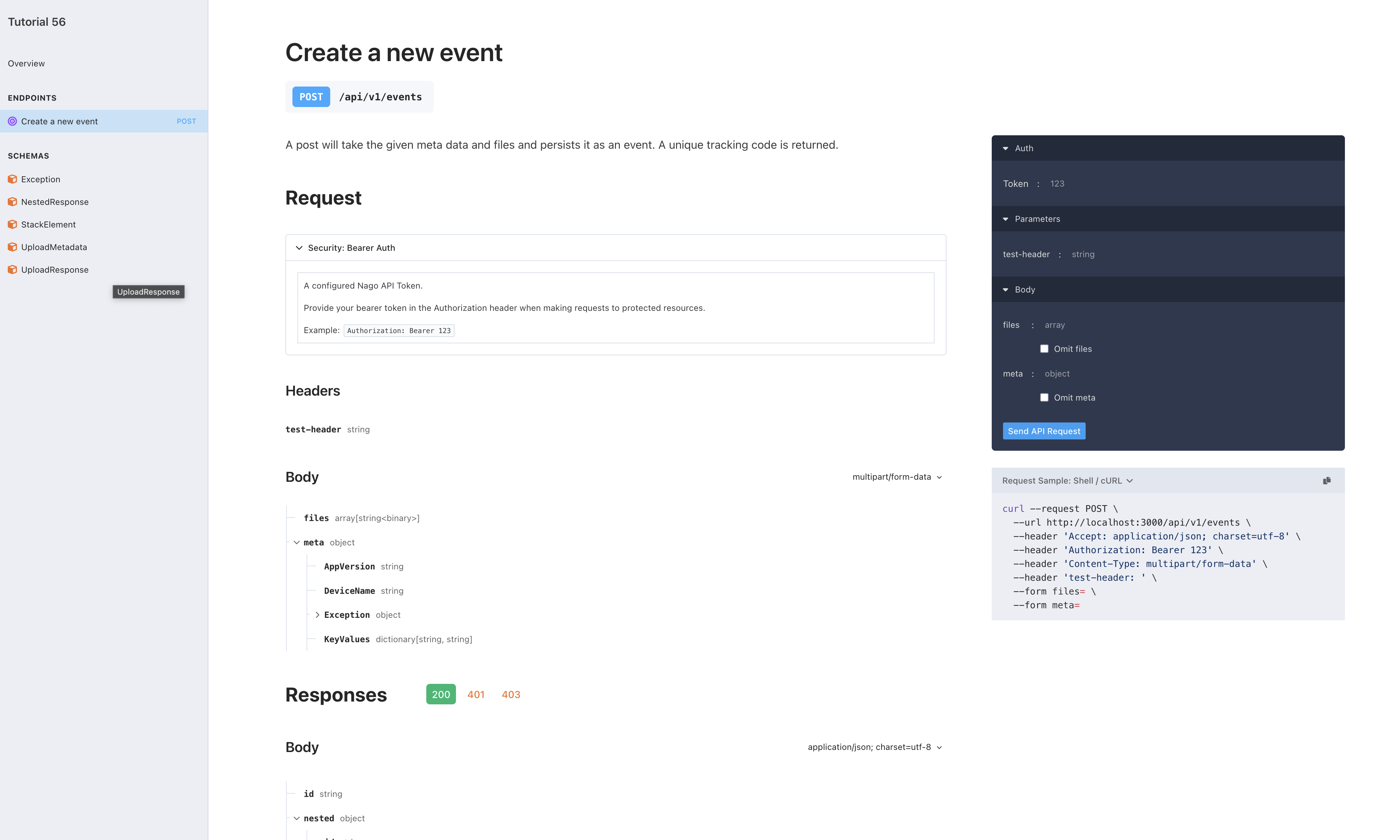 hapi.Post[UploadRequest](api, hapi.Operation{Path: "/api/v1/events", Summary: "Create a new event", Description: "A post will take the given meta data and files and persists it as an event. A unique tracking code is returned."}).