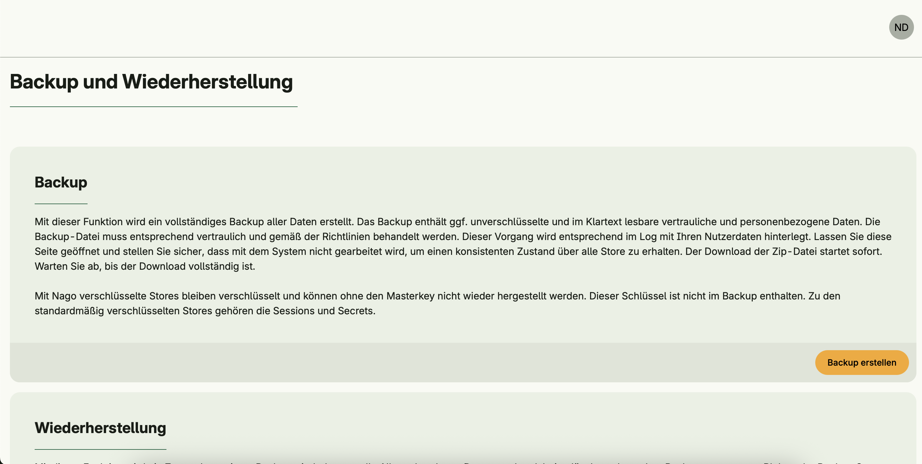 Creates a complete backup of the application data. Encrypted stores remain encrypted and cannot be restored without the master key. The backup file is downloaded as a ZIP.