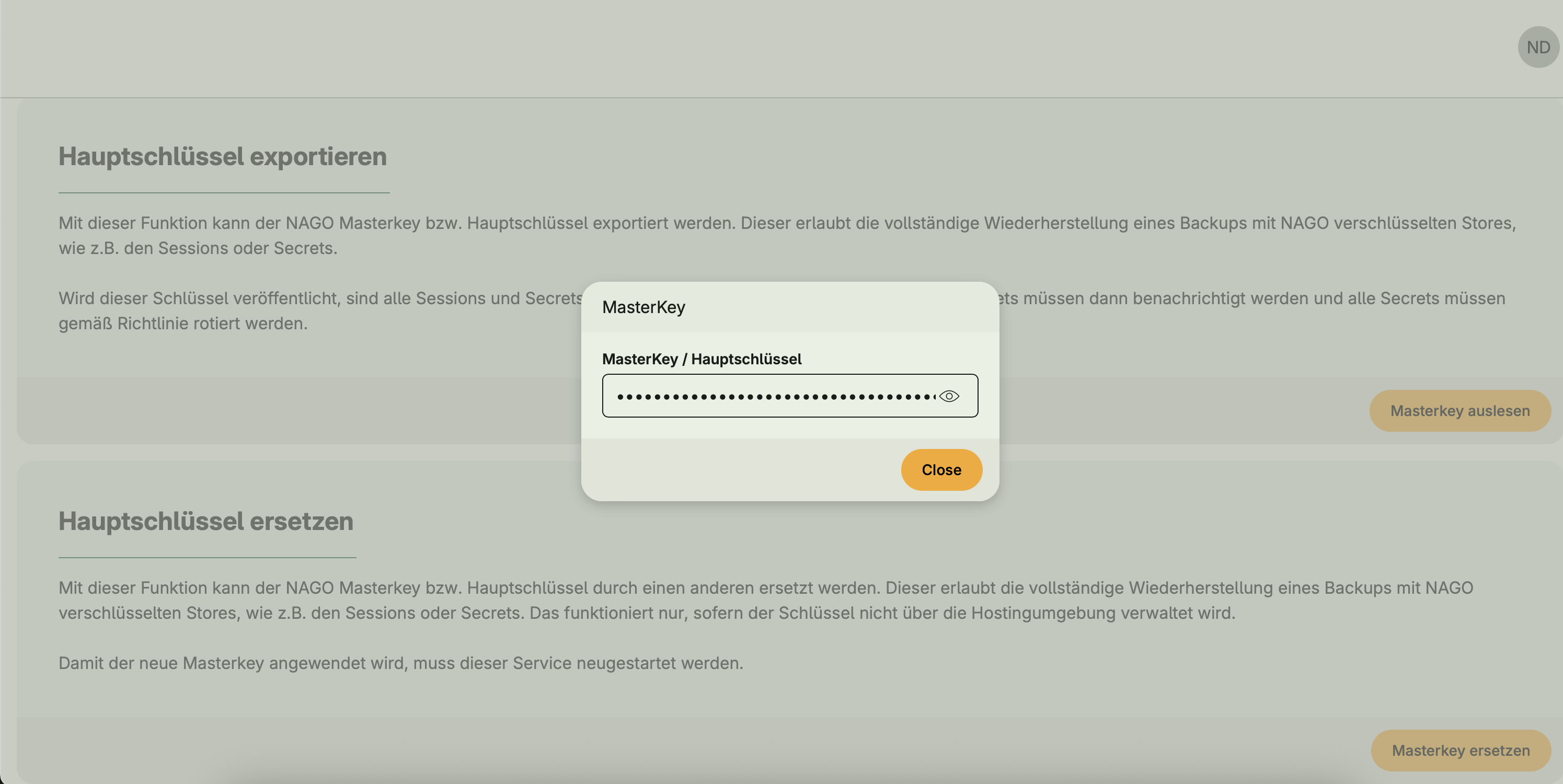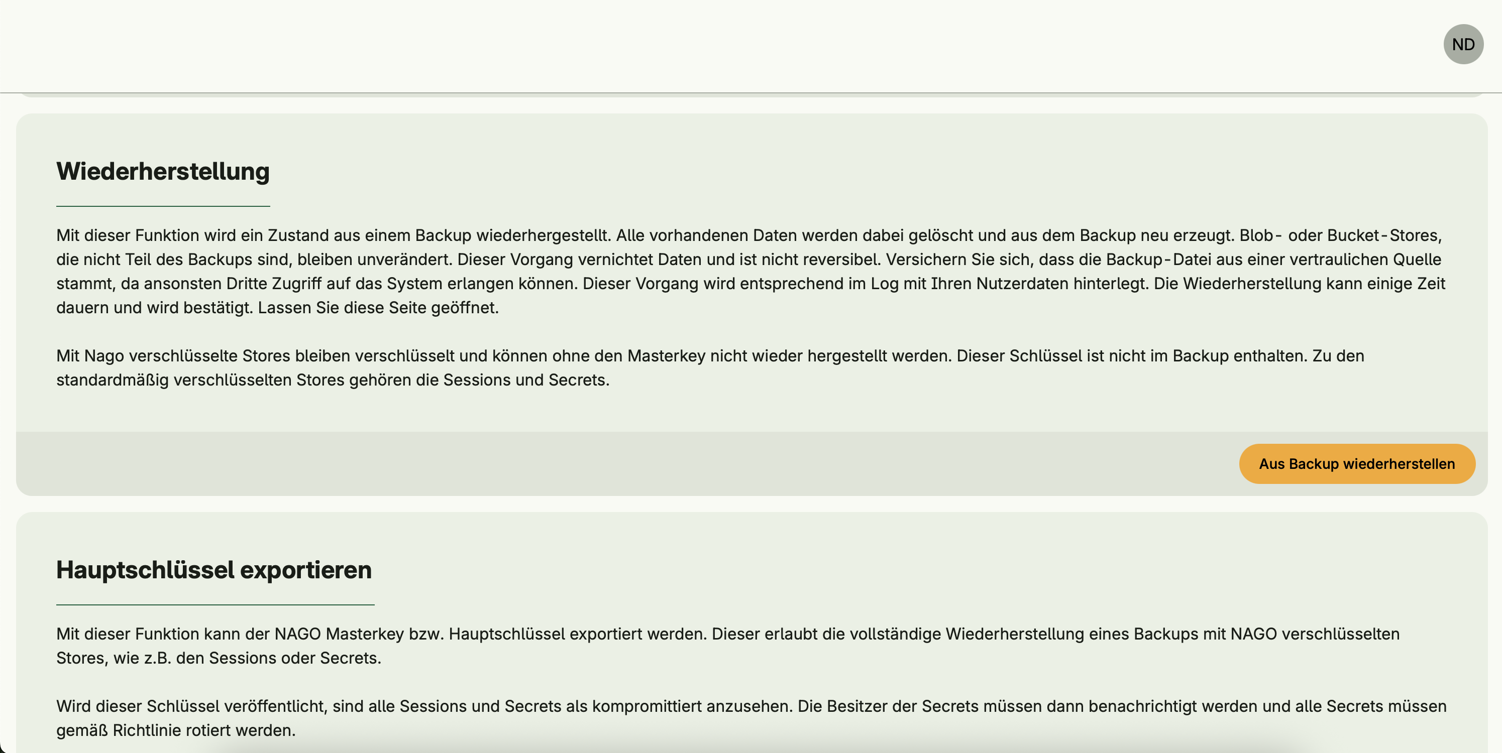 Allows the export of the Nago master key. This key is required to decrypt encrypted stores in backups (e.g., sessions or secrets).