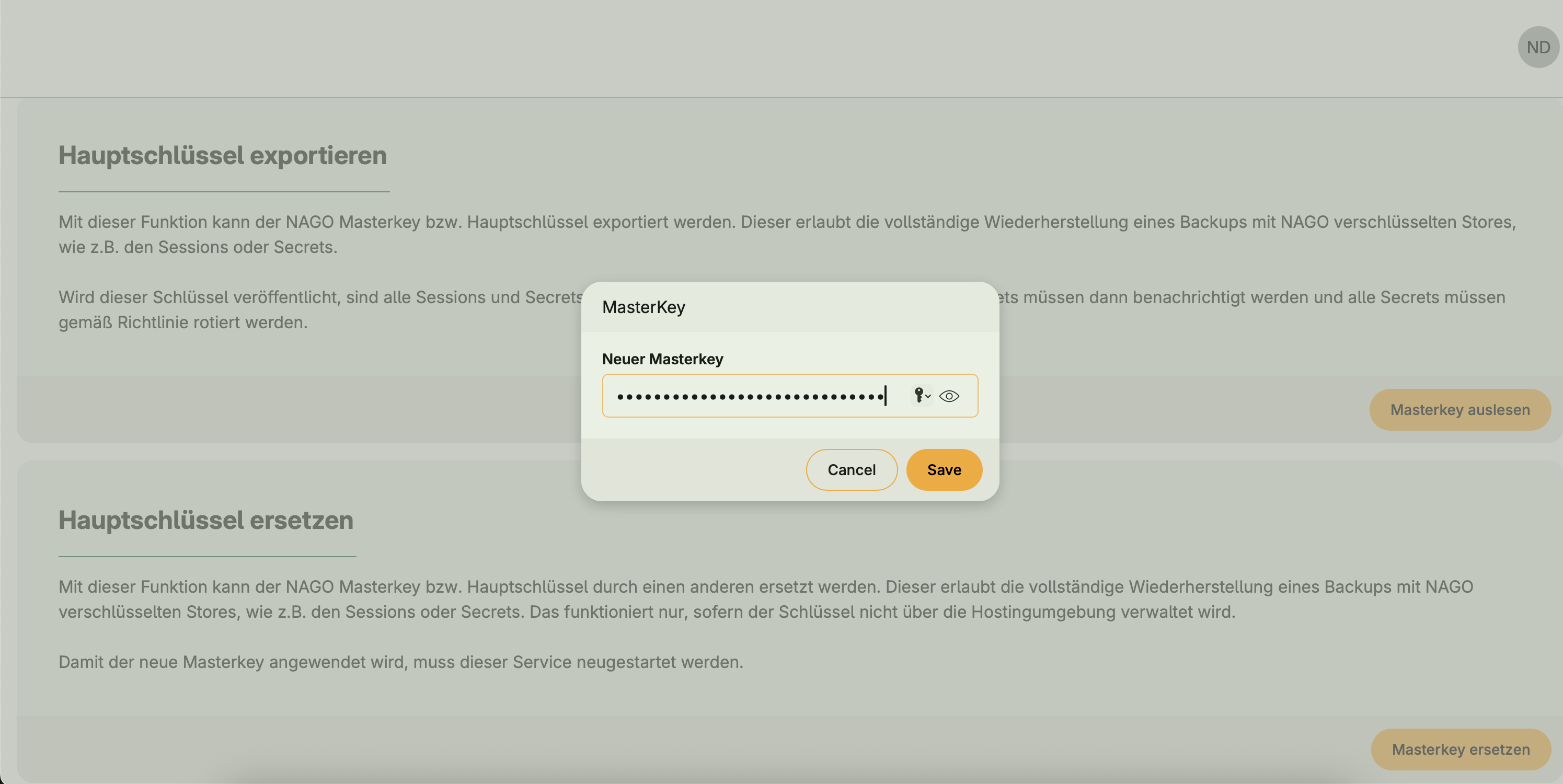 Allows replacing the current Nago master key with a new one. All encrypted stores will then require the new key for decryption.
